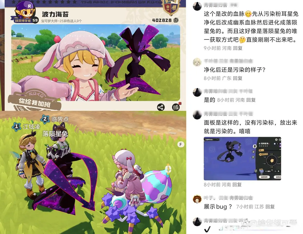 还有就是有玩家通过BUG刷出来了一只超级好看的“污染落陨星兔”,目前也是全网唯一一只,这个可比什么黑白异色稀有多了!根据该玩家的描述,得到的详细步骤就是噩梦粉星仔净化,改血脉,喂果子升级,再进化,传送一下朋友,丢出来就是污染的,只有在大世界显示污染。
